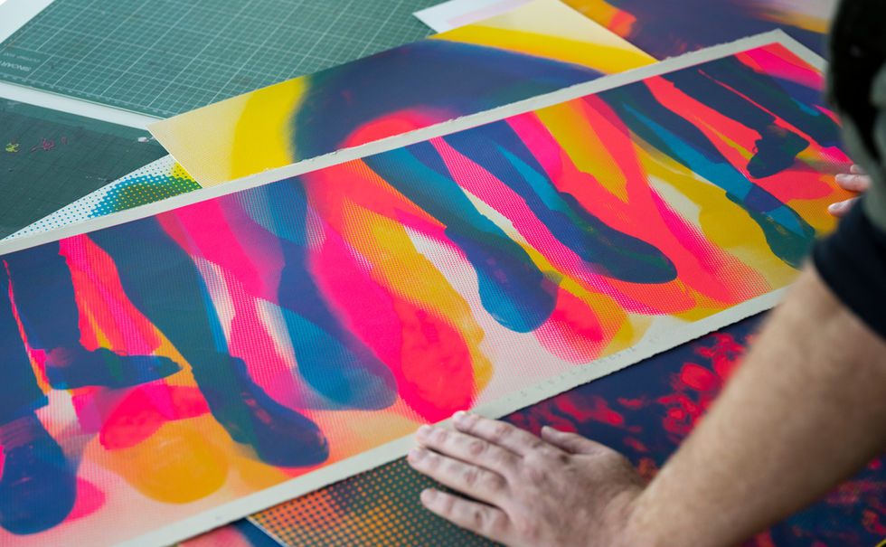 unpredictability, rips, creases, and chance alignments became central to the compositions. Screen prints combined with risograph overlays created hybrid works that reflect the layered, lived texture of the city itself. The series is about allowing accidents to reshape the work, mirroring how environments reshape identity.